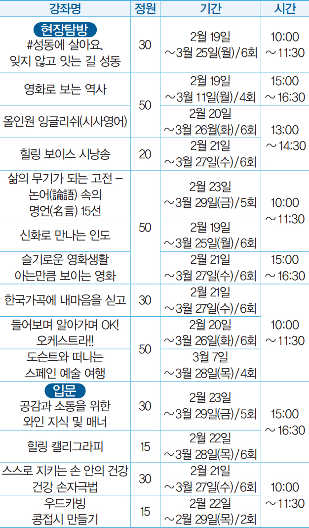 성동구민대학 봄학기(3월 ~ 5월) 수강생 모집